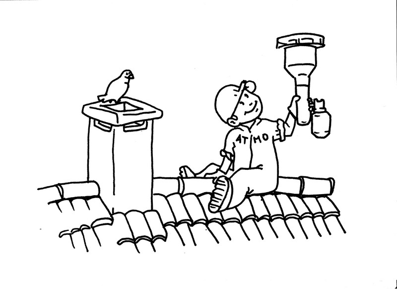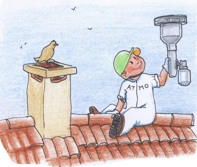 Atmo assis sur un toit mesure la pollution de l'air grace à un capteur