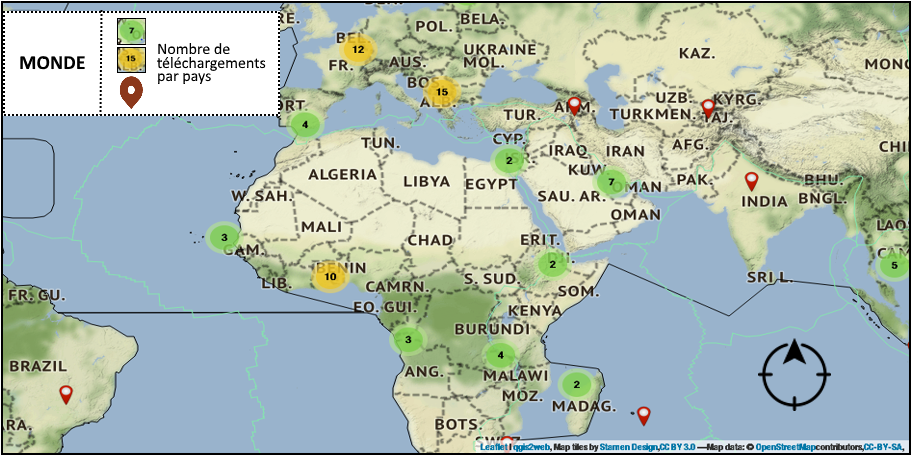 La carte ci-dessous présente le nombre de téléchargements par pays (soit un total de 137 652 téléchargements). Elle est également présente sur le rapport statistiques descriptives du site (voir figure 13).